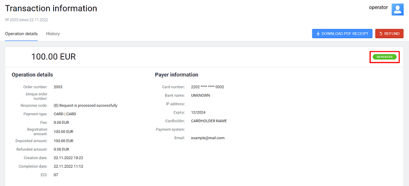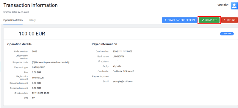 Then go to the Transaction details block and click Complete button to deposit the payment: