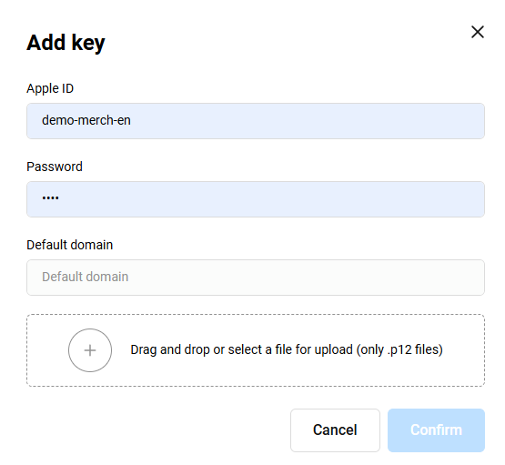 To receive payments via Apple Pay, you need to have a key pair (private and public key) and the corresponding public key certificate. The required actions in the Personal Area depend on whether you already have a key pair and the corresponding certificate or not.