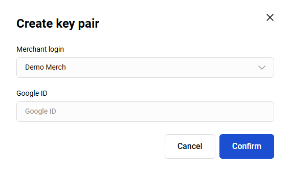 The following form will be displayed. - Fill in the Google ID field with your Google Merchant ID obtained from Google Pay during integration with Google API, then click Confirm.