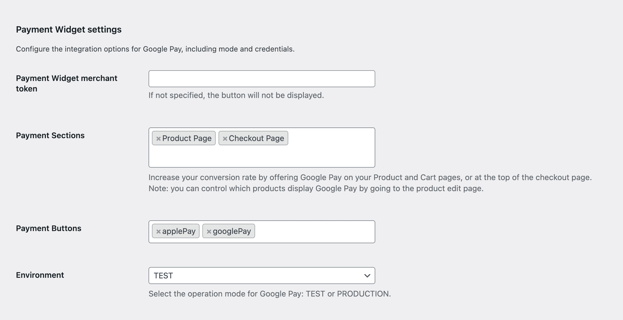 After the basic settings section, there is a section Payment Widget settings with settings for Google Pay and Apple Pay payments: