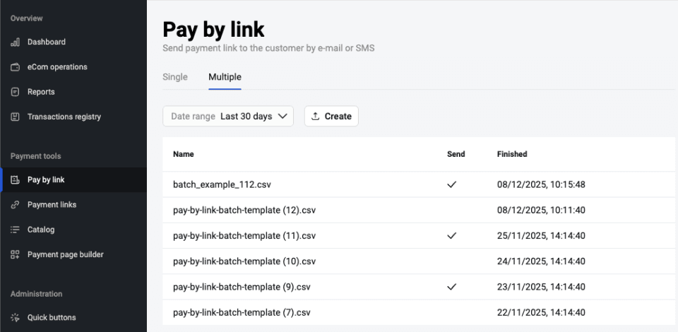 Go to the Pay by Link section and open the Multiple tab. The page displays the list of already uploaded files (if they present).